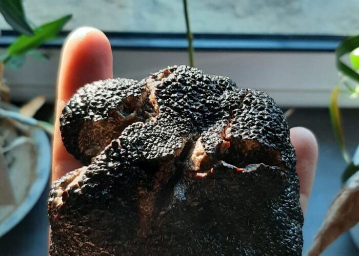 Peau noire et verruqueuse, chair noire veinée de blanc (gleba) à maturité